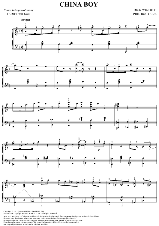 Digital Sheet Music for China Boy by Teddy Wilson, Dick Winfree, Phil Boutelje scored for Piano Solo; id:315921