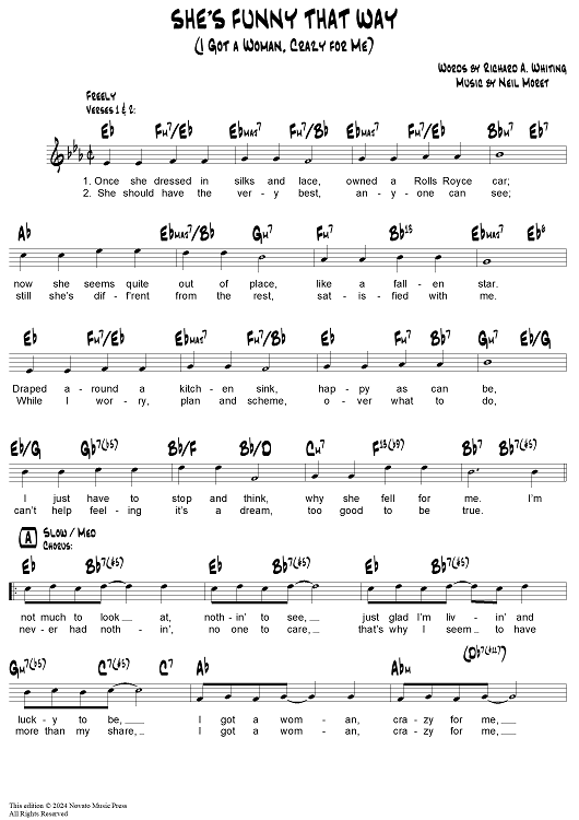 Digital Sheet Music for (I Got a Woman, Crazy for Me) She's Funny that Way by Richard A. Whiting, Neil Moret scored for Lead Sheet; id:315153