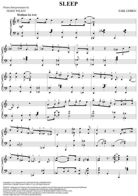 Digital Sheet Music for Sleep by Teddy Wilson, Earl Lebieg scored for Piano Solo; id:315922