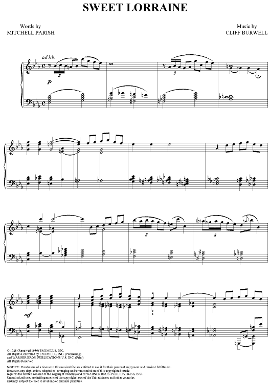 Digital Sheet Music for Sweet Lorraine by Mitchell Parish, Cliff Burwell scored for Piano Solo; id:289253
