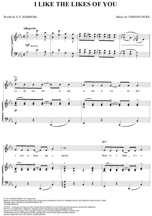 Digital Sheet Music for I Like the Likes of You by E.Y. "Yip" Harburg, Vernon Duke scored for Piano/Vocal/Chords; id:288016