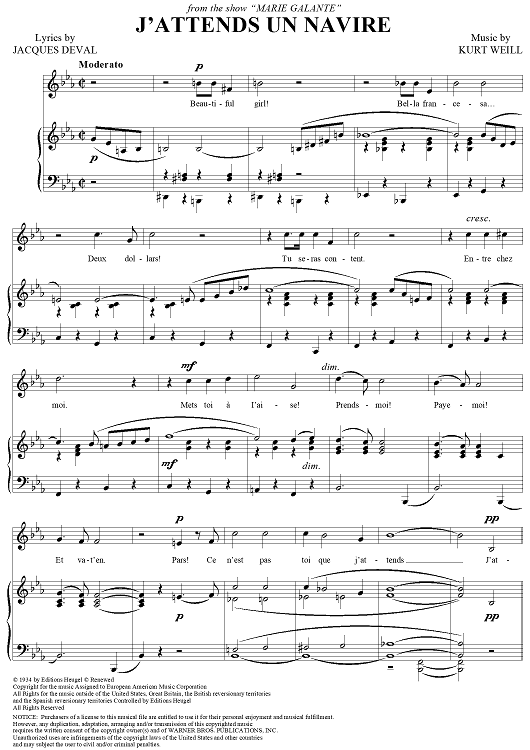 Digital Sheet Music for J'Attends un navire by Jacques Deval, Kurt Weill scored for Piano/Vocal; id:263501