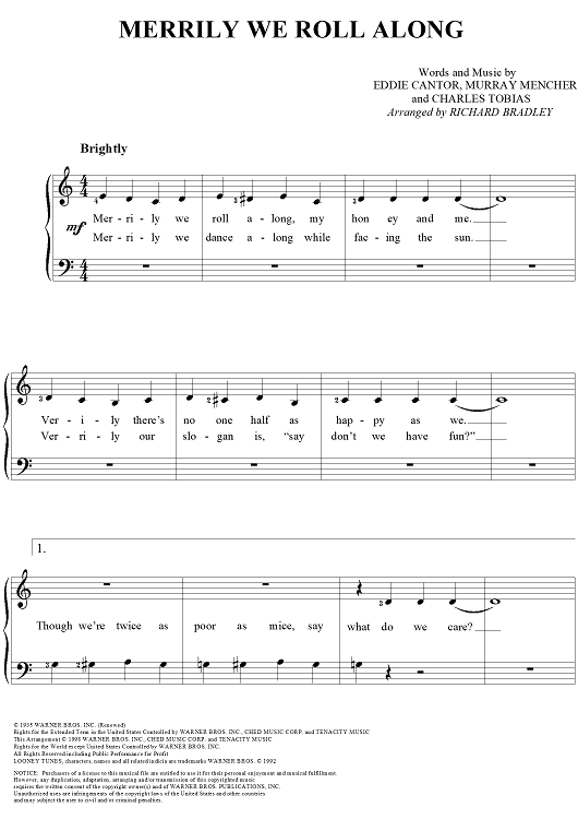 Digital Sheet Music for Merrily We Roll Along by Eddie Cantor, Charlie Tobias, Richard Bradley, Murray Mencher scored for Easy Piano/Vocal; id:120617