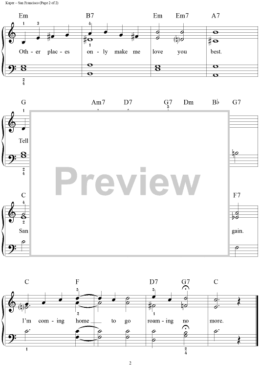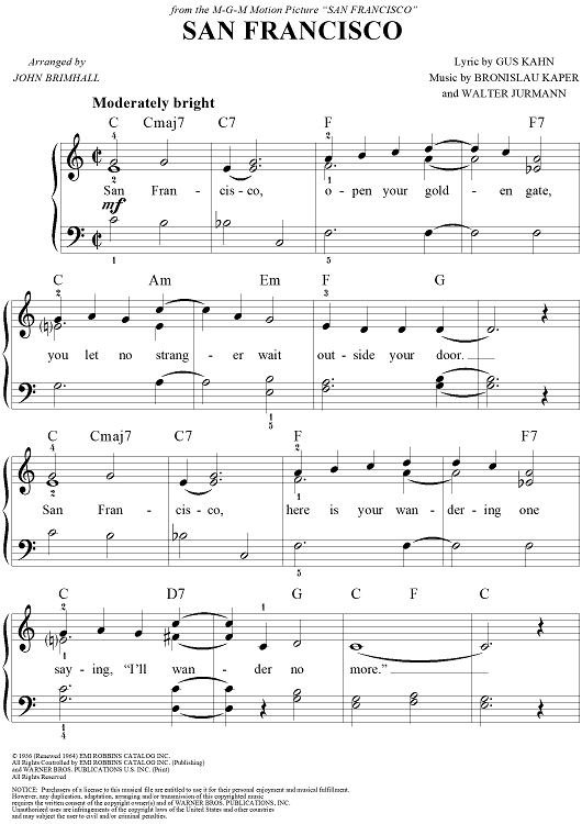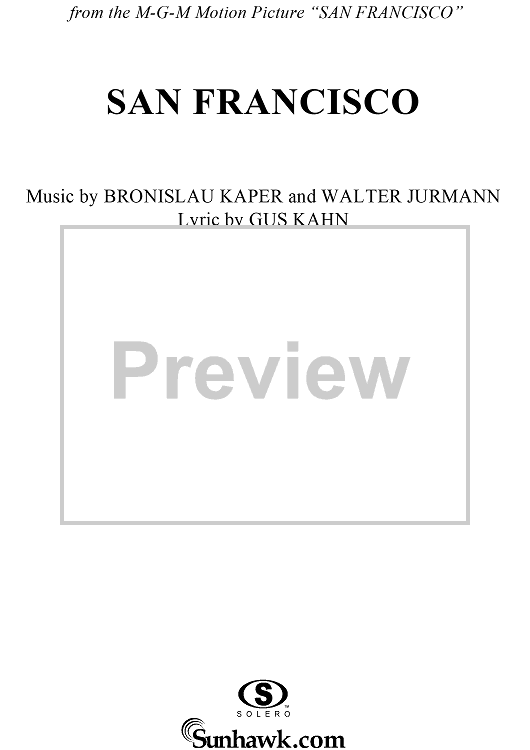 Digital Sheet Music for San Francisco by Gus Kahn, Bronislau Kaper, Walter Jurmann, John Brimhall scored for Easy Piano/Vocal; id:249747
