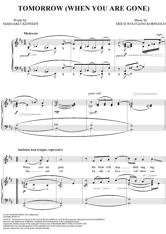 "Tomorrow (When You Are Gone)" Sheet Music by Erich Wolfgang Korngold