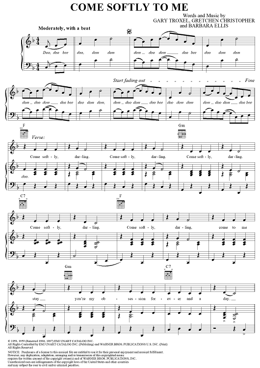 Digital Sheet Music for Come Softly to Me by Gretchen Christopher, Barbara Ellis, Gary Troxel scored for Piano/Vocal/Chords; id:260818