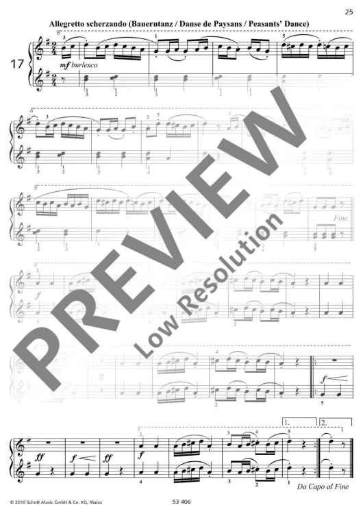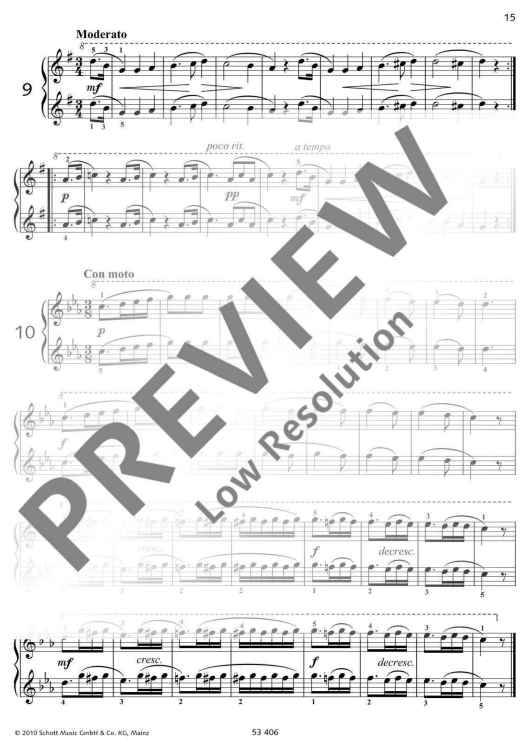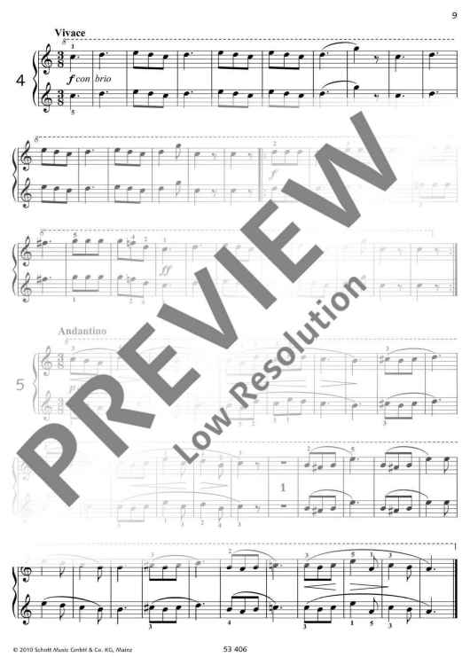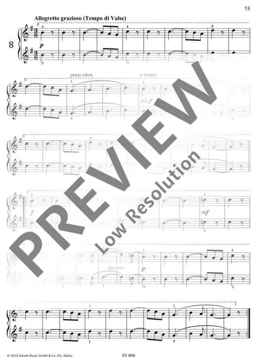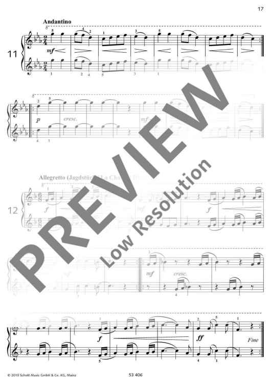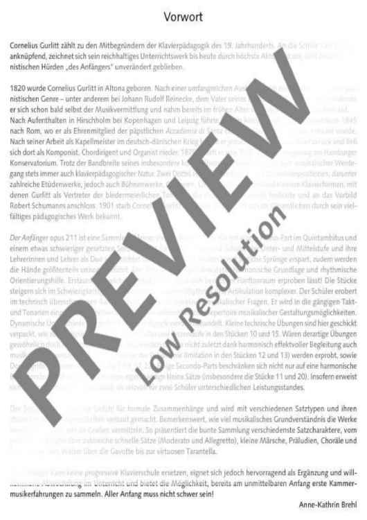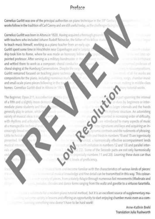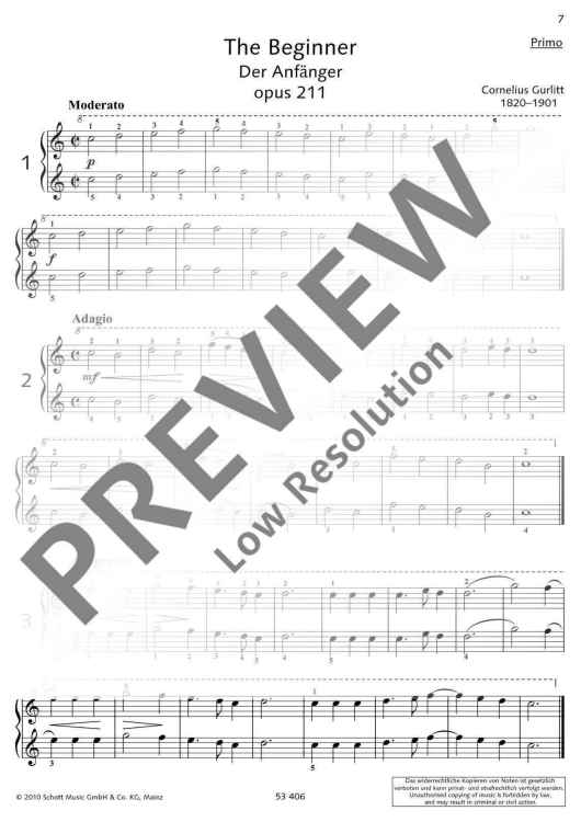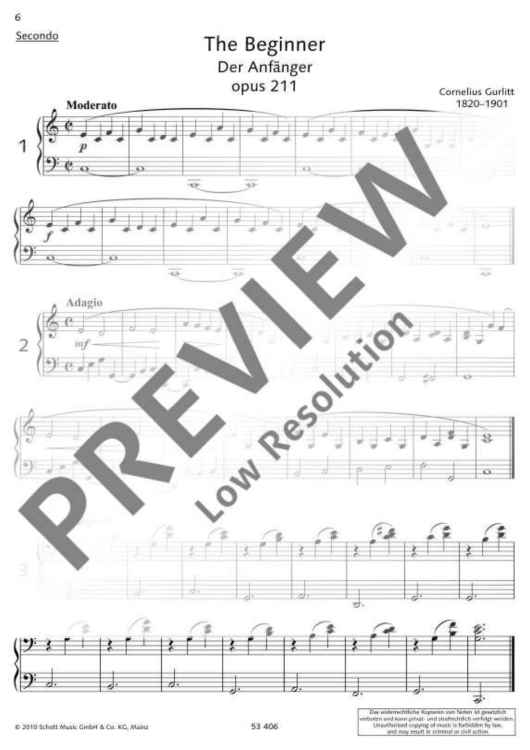 Cornelius Gurlitt is one of the co-founders of 19th-century piano teaching. Going on from the method of Carl Czerny, his rich educational material is extremely topical even today. Der Anfänger is a collection of little pieces for four hands with an easy primo and a somewhat more difficult secondo part which are ideal for music lessons at elementary and intermediate levels or as duos for pupil and teacher. In the primo part, the hands for the most part play in unison; due to an inventive harmonic accompaniment, however, the little pieces become musically interesting exercises. The level of difficulty increases with regard to rhythm, articulation, time and key as well as dynamics and possibilities of musical interpretation. Thus, this colourful collection of highly different settings - from the solemn adagio via fast movements, little marches, chorales and dance forms to the virtuoso tarantella - is a valuable addition to the music teaching literature.