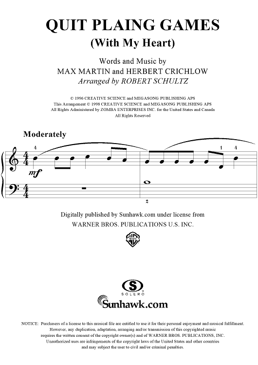 Digital Sheet Music for Quit Playing Games (With My Heart) by Max Martin, Herbie Crichlow, Backstreet Boys scored for Five Finger Piano; id:220603