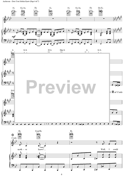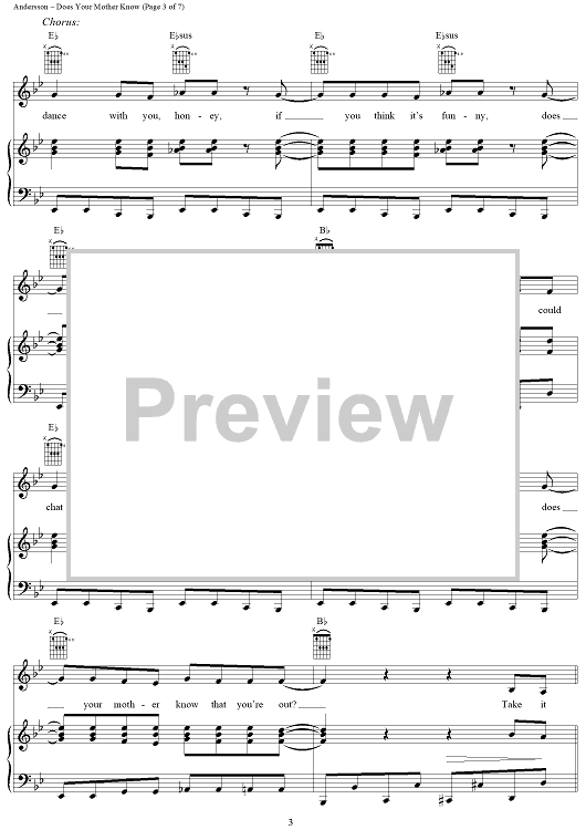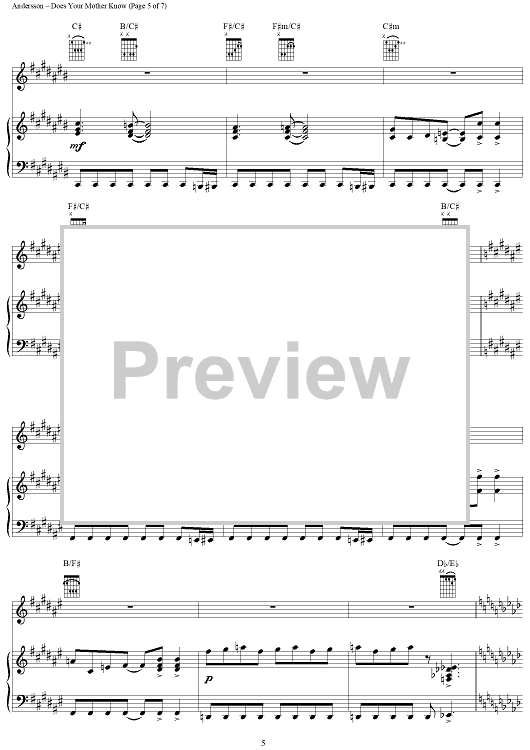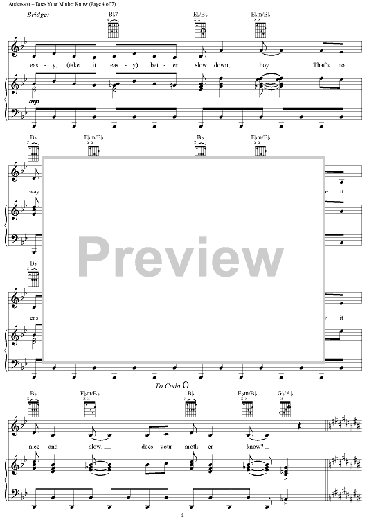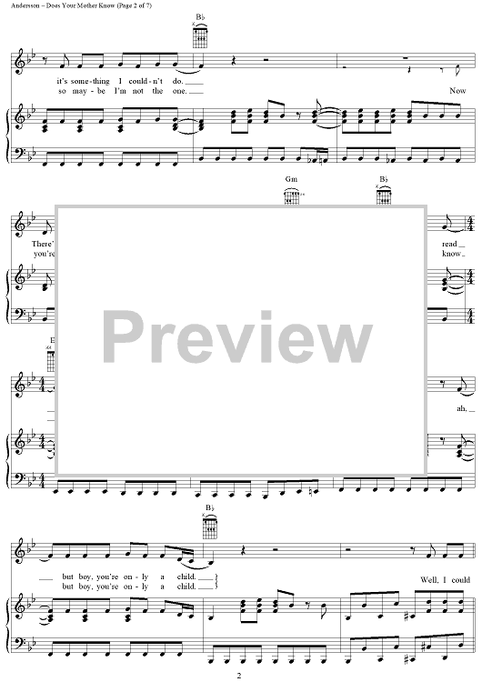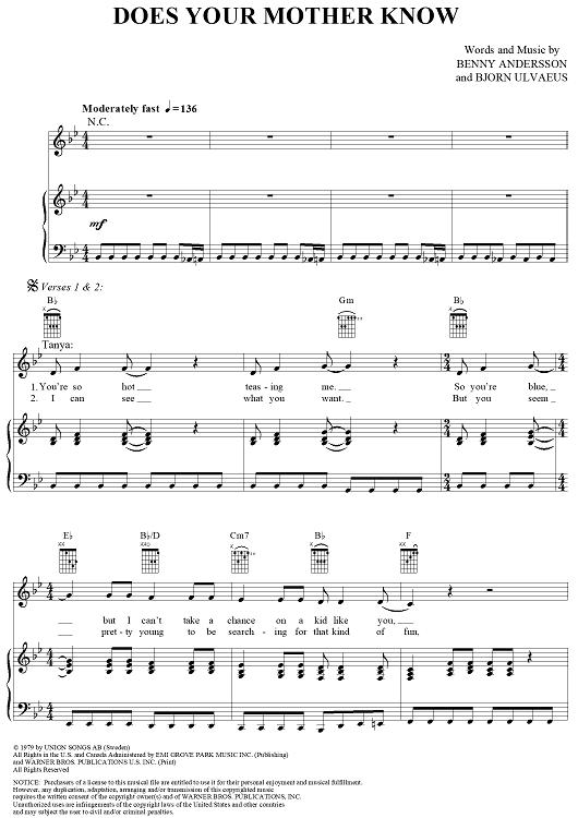 Digital Sheet Music for Does Your Mother Know by ABBA, Benny Andersson, Bjorn Ulvaeus scored for Piano/Vocal/Chords; id:314979