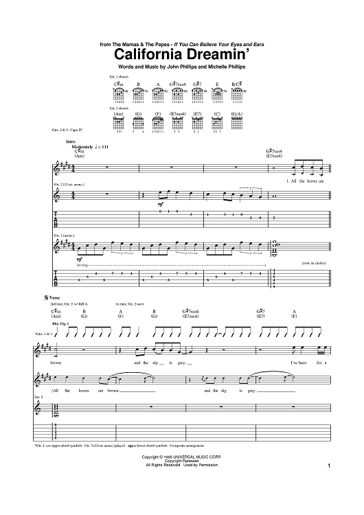 Digital Sheet Music for California Dreamin' by The Mamas and The Papas, Michelle Phillips, John Phillips scored for Guitar Tab; id:381456