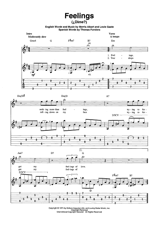 Digital Sheet Music for Feelings (¿Dime?) by Morris Albert, Louis Gaste, Thomas Fundora scored for Guitar Tab/Vocal/Chords; id:442854