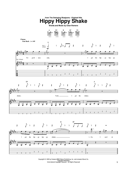 Digital Sheet Music for Hippy Hippy Shake by Chan Romero, The Swinging Blue Jeans scored for Guitar Tab; id:372851