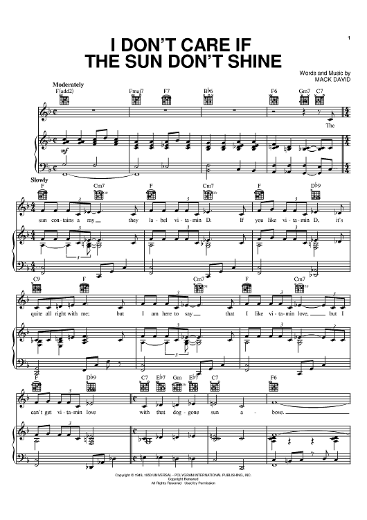 Digital Sheet Music for I Don't Care If The Sun Don't Shine by Elvis Presley, Mack David, Dean Martin, Patti Page scored for Piano/Vocal/Chords; id:381780