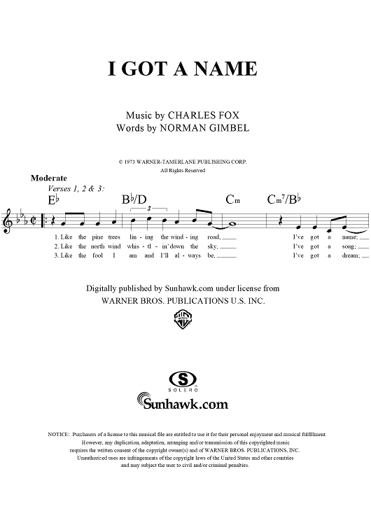 Digital Sheet Music for I Got a Name by Jim Croce, Norman Gimbel, Charles Fox scored for Lead Sheet; id:235264