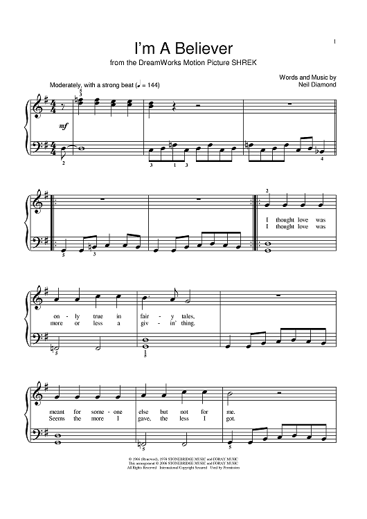 Digital Sheet Music for I'm A Believer by Neil Diamond, Smash Mouth, Mona Rejino scored for Piano; id:389041