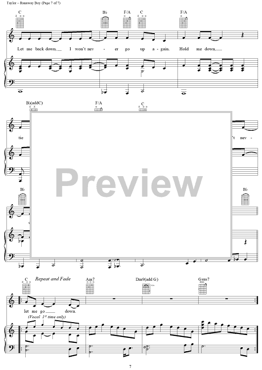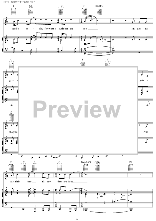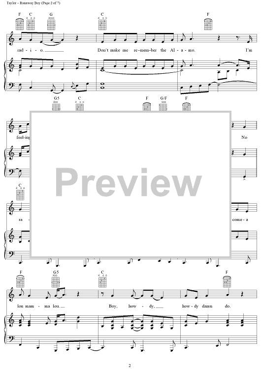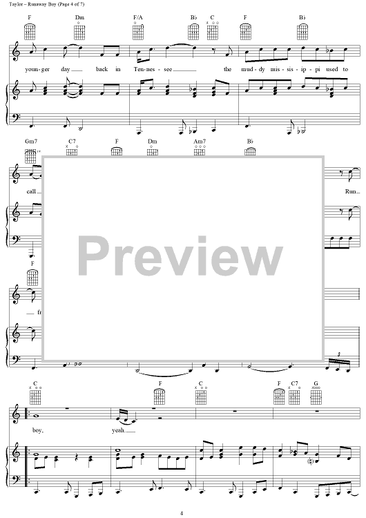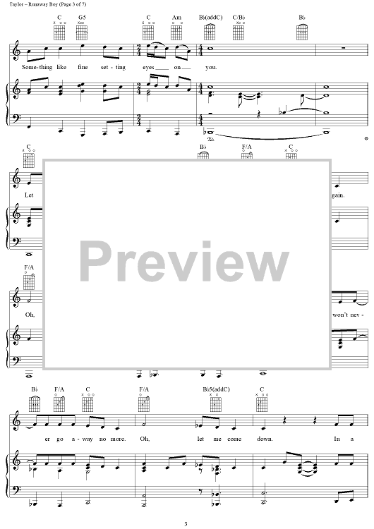 Digital Sheet Music for Runaway Boy by James Taylor scored for Piano/Vocal/Chords; id:112447