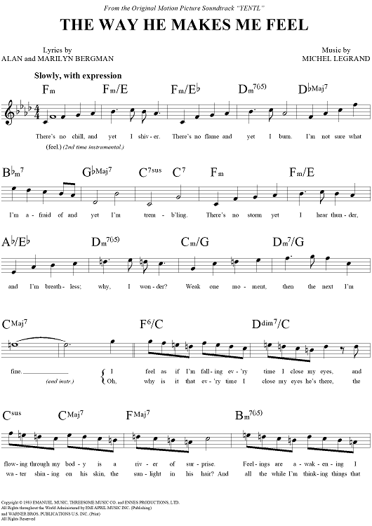 Digital Sheet Music for The Way He Makes Me Feel by , Michel LeGrand, Alan Bergman, Marilyn Bergman, Barbra Streisand scored for Lead Sheet; id:111727