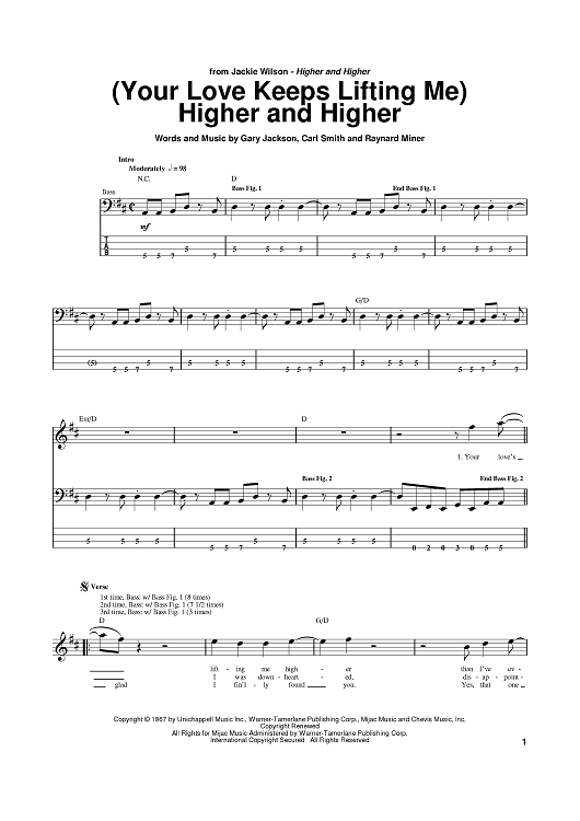 Digital Sheet Music for (Your Love Keeps Lifting Me) Higher And Higher by Jackie Wilson, Rita Coolidge, Carl Smith, Raynard Miner, Gary Jackson scored for Bass Tab; id:384119