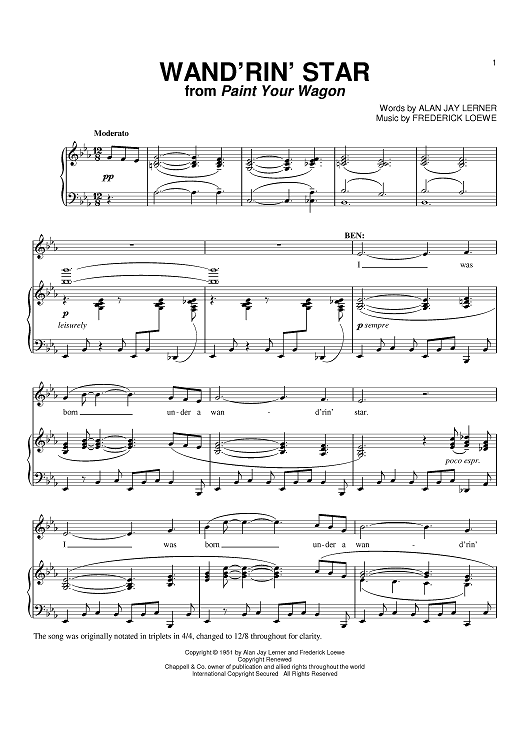 "Wand'rin' Star" Sheet Music by Frederick Loewe