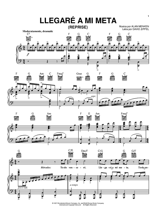 Digital Sheet Music for Llegare A Mi Meta (Reprise) by David Zippel, Alan Menken scored for Piano/Vocal/Chords; id:368655