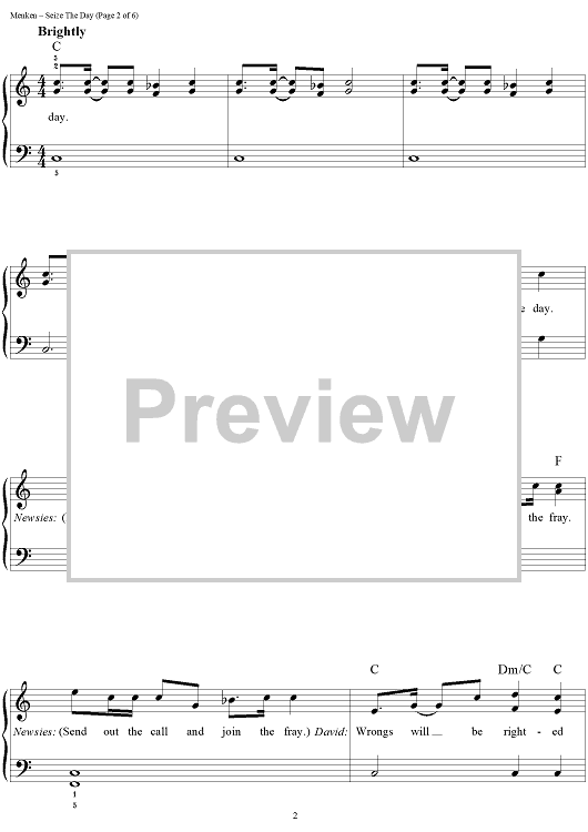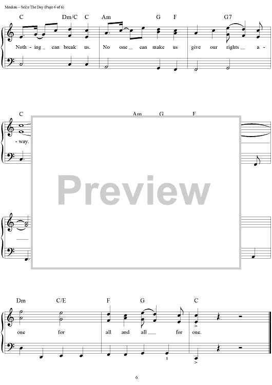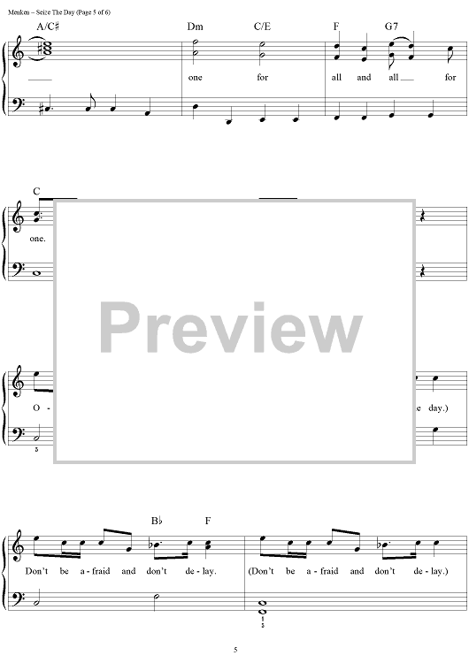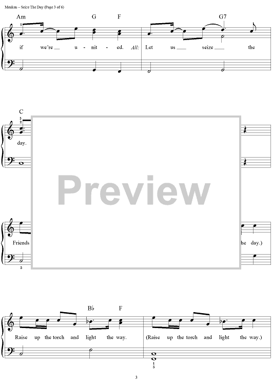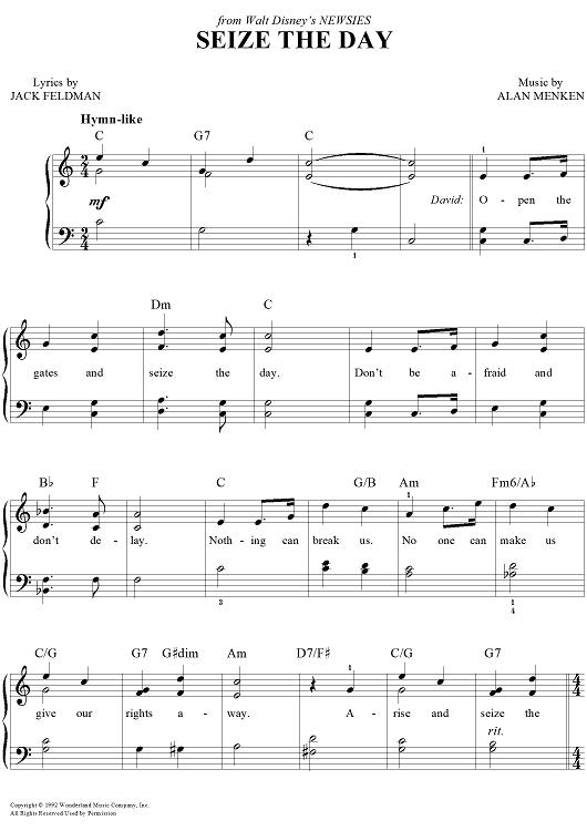 Digital Sheet Music for Seize The Day by Alan Menken, Jack Feldman scored for Easy Piano/Vocal/Chords; id:453215