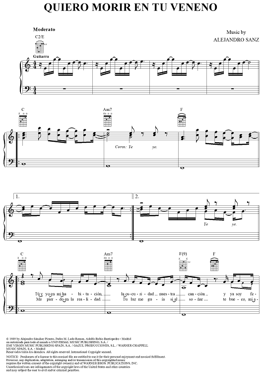"Quiero Morir En Tu Veneno" Sheet Music by Alejandro Sanz