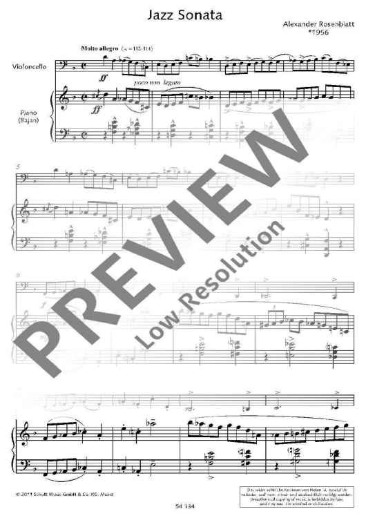 Alexander Rosenblatt, born in Moscow in 1956, completed his piano and composition studies at the renowned conservatoire of his home town. In his compositions, he combines classical elements with jazz elements to form an original blend of styles, a very characteristic musical language. He made himself a name as a pianist, especially in the piano duo with O. Sinking, a genre which then earned him great success as a creative artist as well: In 2001 he won a special award for his 'Modern Piano Duet' at the International Composition Competition in Tokyo. His violoncello sonata follows the classical steps, with musical greetings to Prokofiev and Shostakovich, its characteristic forward-rushing, impetuous style being interrupted again and again by quieter and more tranquil sections. It is a rewarding, joyful-to-play work for every cello soloist who can choose his accompaniment: piano or accordion!