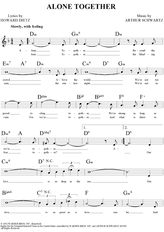 "Alone Together" is a song composed by Arthur Schwartz with lyrics by Howard Dietz. It was introduced in the Broadway musical 'Flying Colors' in 1932 by Jean Sargent.