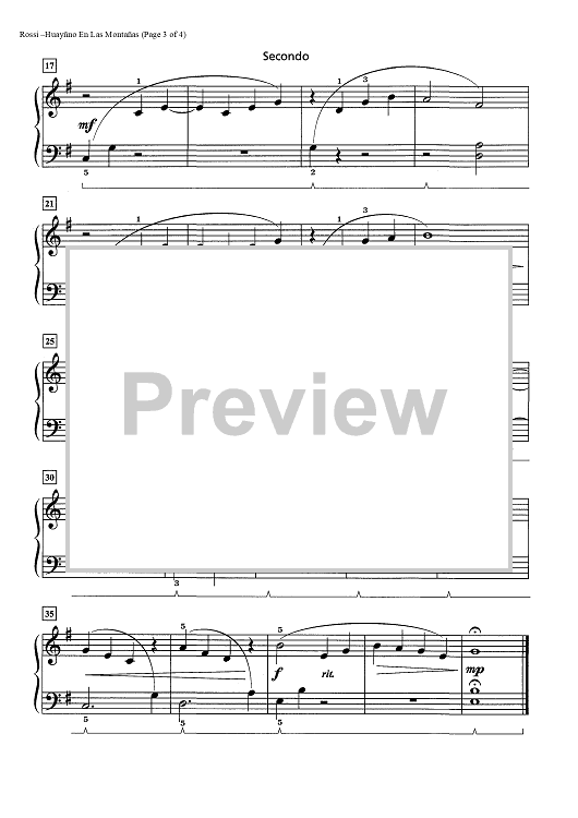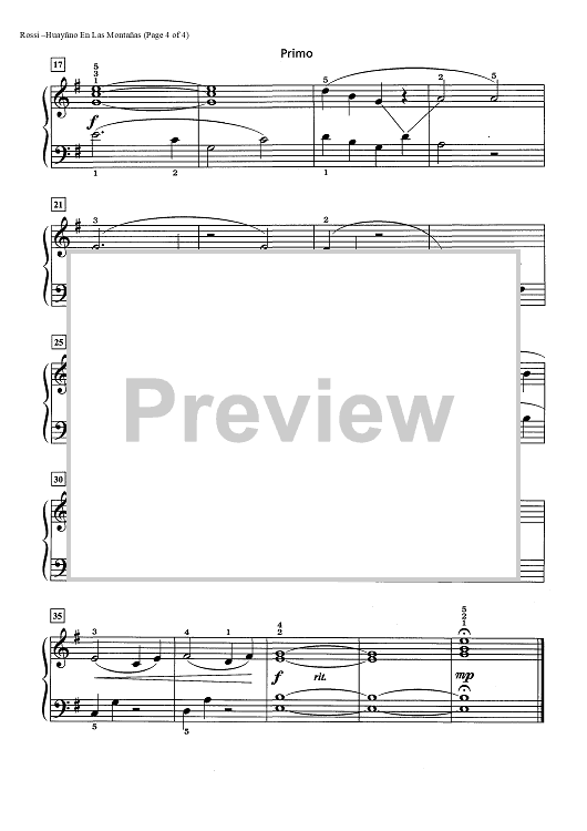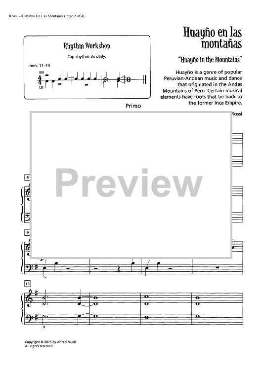 Digital Sheet Music for Huayño en las montañas ("Huayño in the Mountains") by Wynn-Anne Rossi scored for 1 Piano, 4 Hands; id:449407