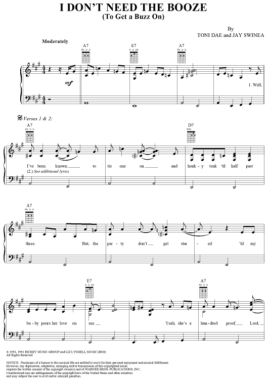 Digital Sheet Music for I Don't Need the Booze (To Get a Buzz On) by Toni Dae, Jay Swinea, Al Jackson Jr scored for Piano/Vocal/Chords; id:271927