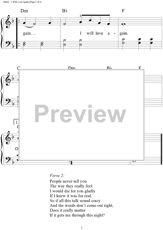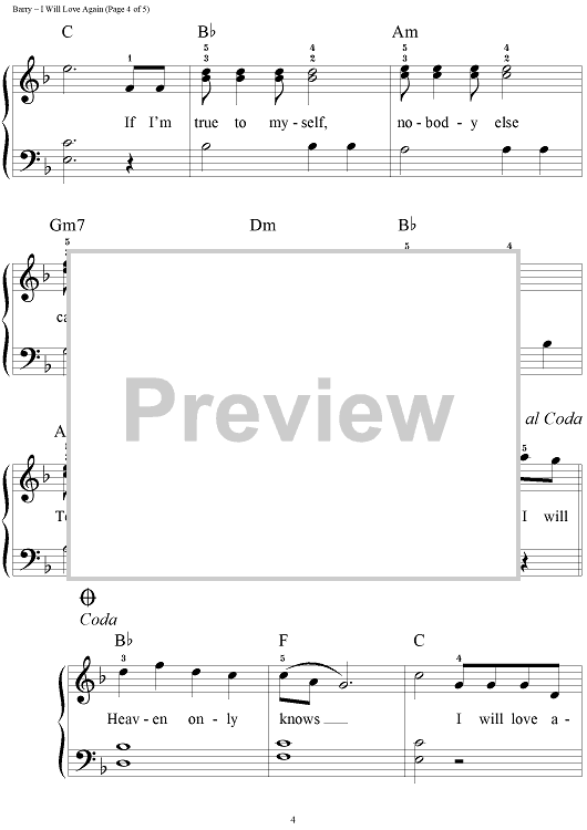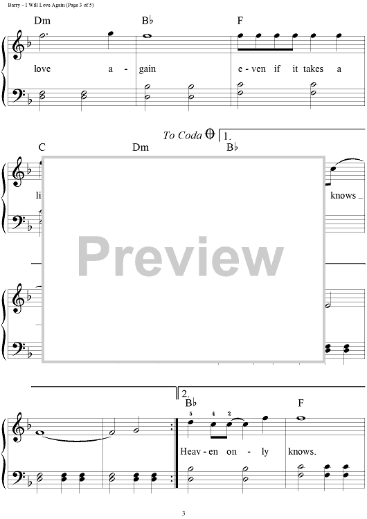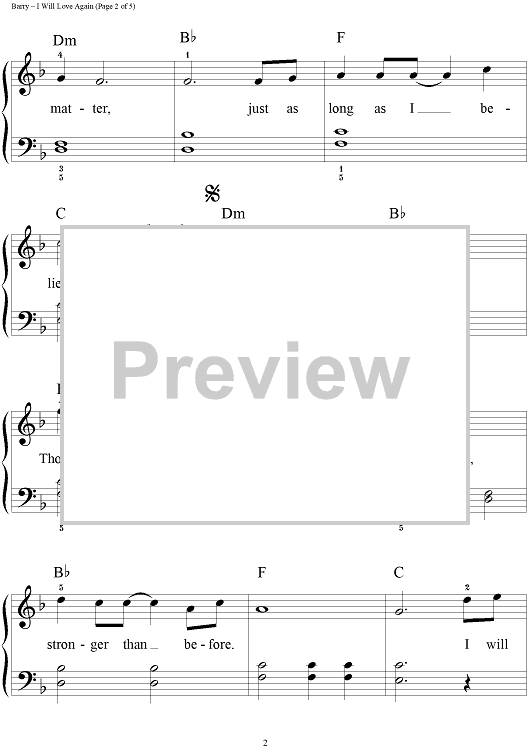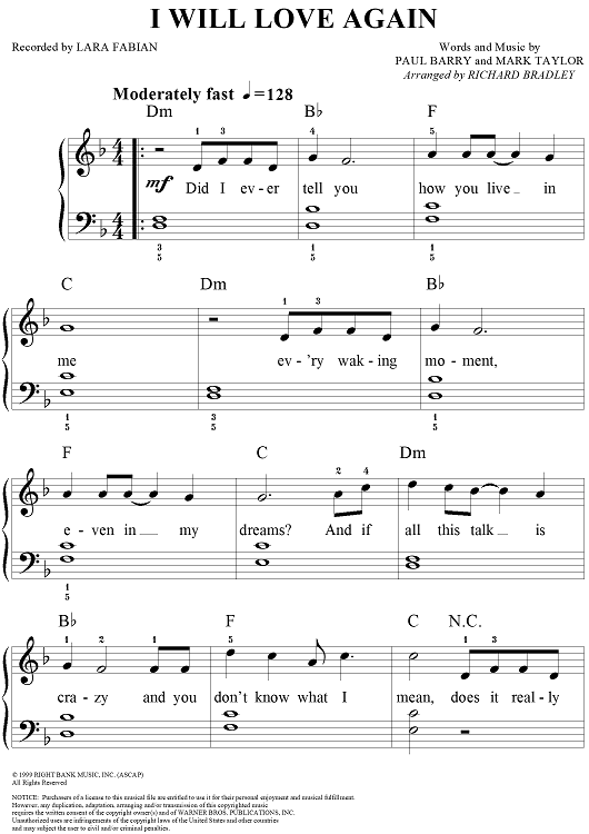 Digital Sheet Music for I Will Love Again by Richard Bradley, Timothy Gatlin, Mark Taylor, Lara Fabian scored for Big Note Piano; id:289564