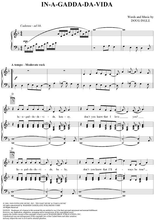 Digital Sheet Music for In-A-Gadda-Da-Vida by Doug Ingle, Iron Butterfly scored for Piano/Vocal/Chords; id:189396