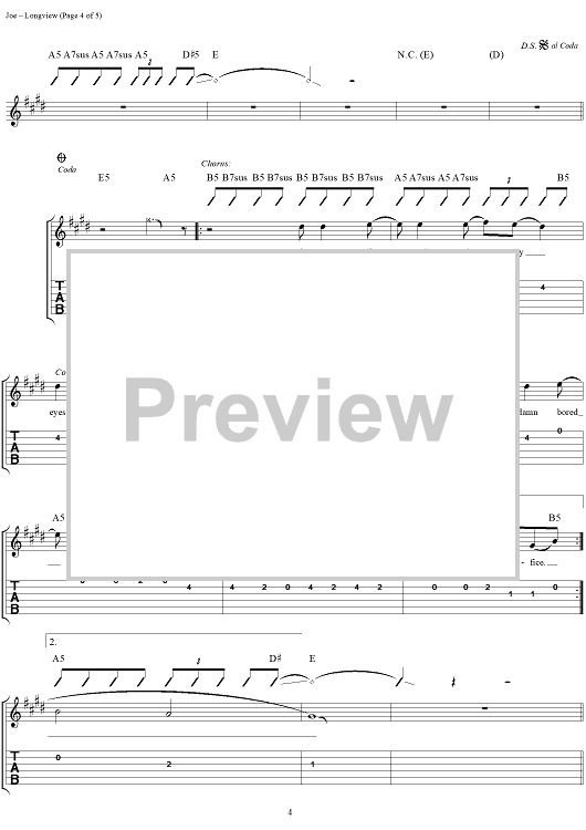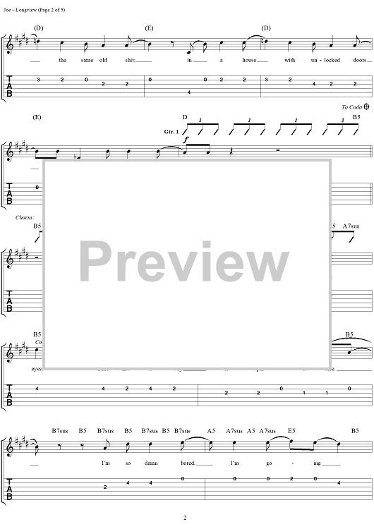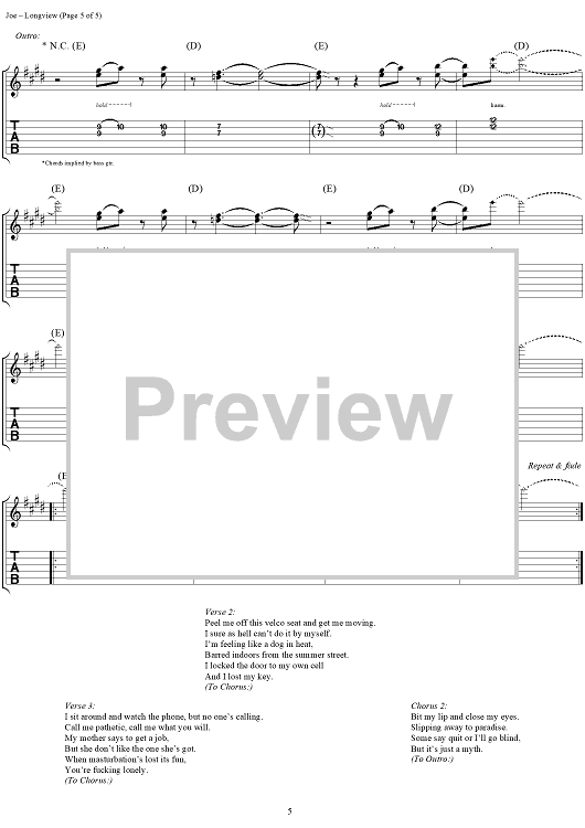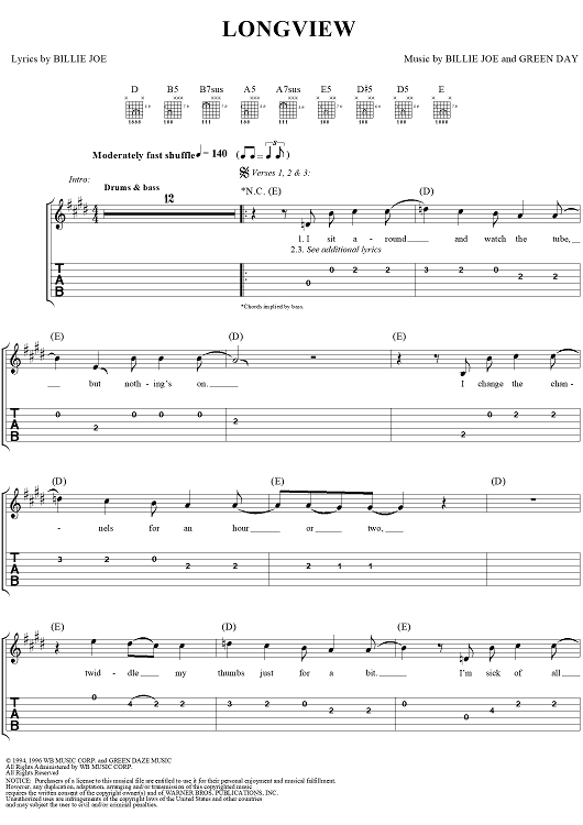 Digital Sheet Music for Longview by Billie Joe Armstrong, Tré Cool, Mike Dirnt, Green Day scored for Easy Guitar/Vocal; id:120678