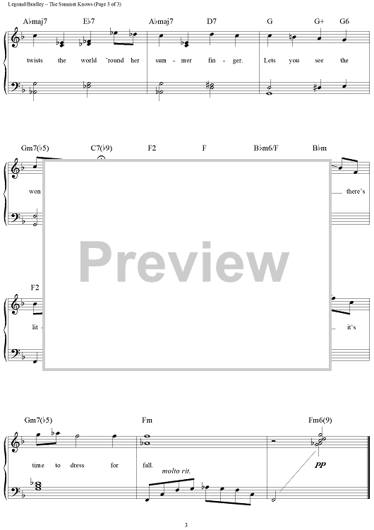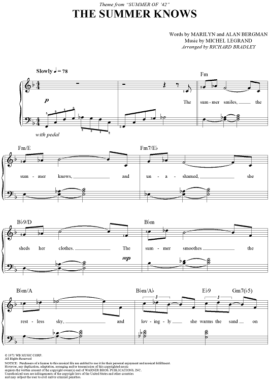 Digital Sheet Music for The Summer Knows (Theme from Summer of '42) by Michel LeGrand, Alan Bergman, Marilyn Bergman, Richard Bradley scored for Easy Piano/Vocal; id:203893