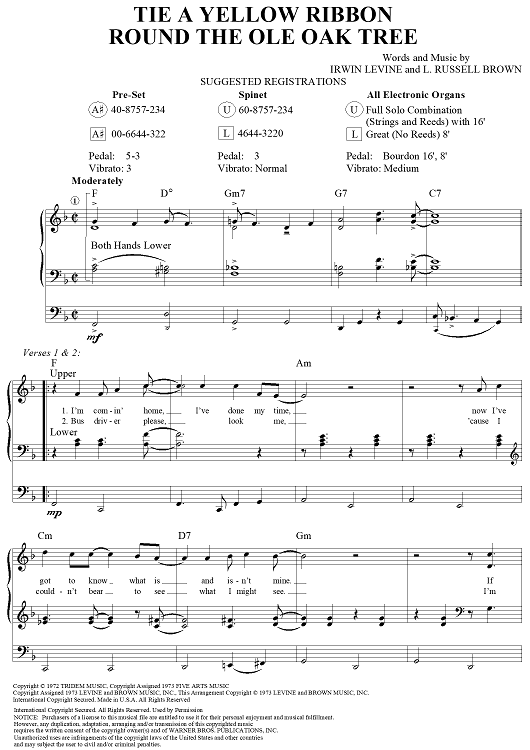 Digital Sheet Music for Tie a Yellow Ribbon Round the Old Oak Tree by Irwin Levine, L. Russell Brown scored for Easy Organ/Vocal; id:250798