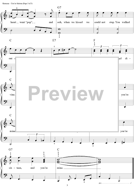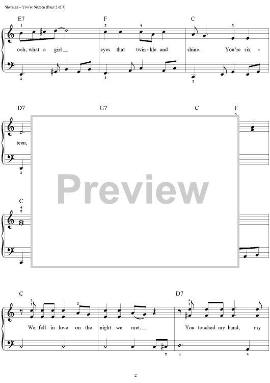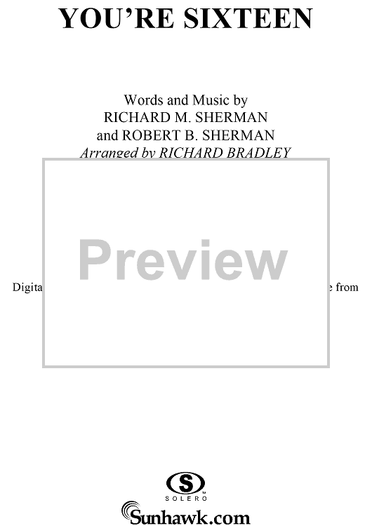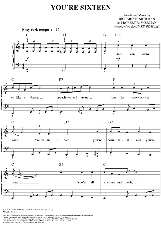 Digital Sheet Music for You're Sixteen by Richard Bradley, Richard M. Sherman, Robert B. Sherman, Johnny Burnette scored for Easy Piano/Vocal; id:283837
