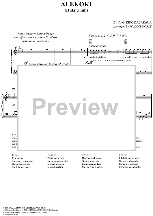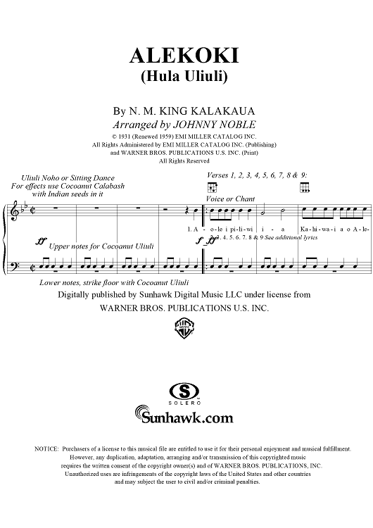 Digital Sheet Music for Alekoki (Hula Uliuli) by H.M. King Kalakaua, Johnny Noble scored for Piano/Vocal/Chords; id:249909