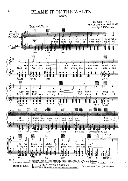 Digital Sheet Music for Blame It On The Waltz by , Gus Kahn, Alfred Solman, E. T. Romeder scored for Ukulele; id:418687