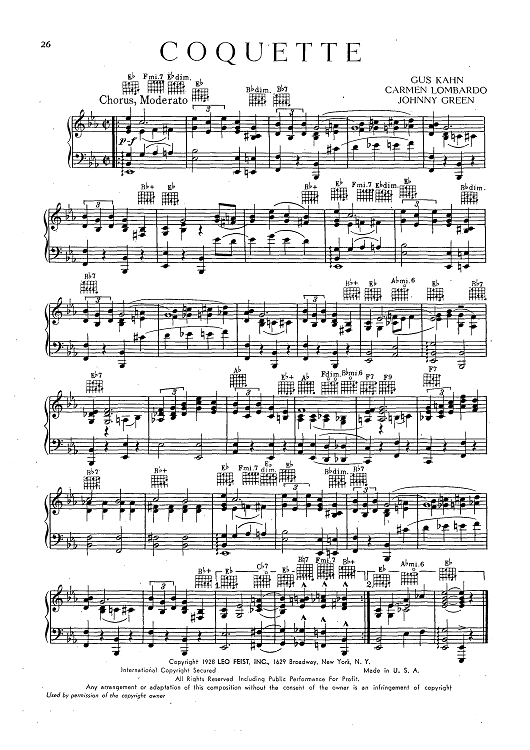 Digital Sheet Music for Coquette by Gus Kahn, Johnny Green, Carmen Lombardo, Bob Zurke scored for Piano Solo; id:423059