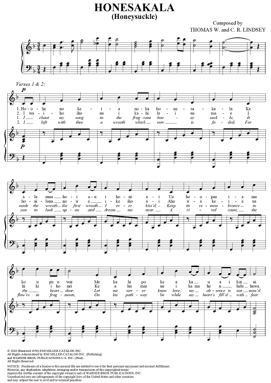 Digital Sheet Music for Honesakala (Honeysuckle) by C. R. Lindsey, W. Thomas scored for Piano/Vocal/Chords; id:261622