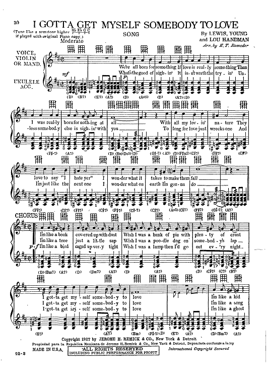 Digital Sheet Music for I Gotta Get Myself Somebody To Love by , Louis Handman, E. T. Romeder, Samuel M. Lewis, Joseph Young scored for Ukulele; id:418698
