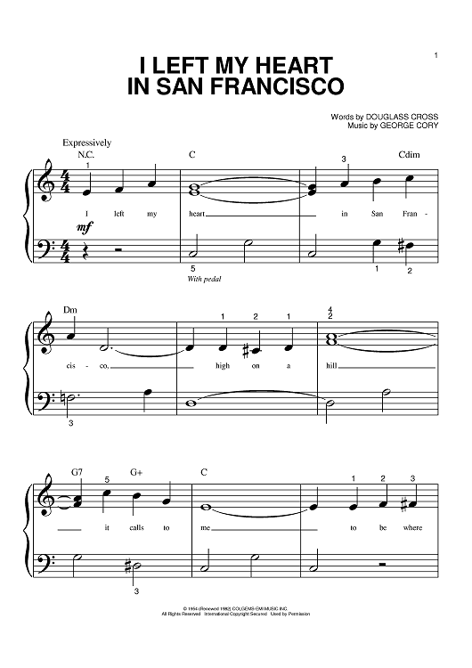 Digital Sheet Music for I Left My Heart In San Francisco by Tony Bennett, George Cory, Douglass Cross scored for Big Note Piano; id:387655