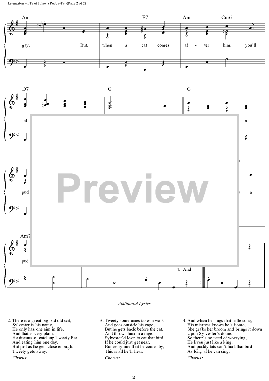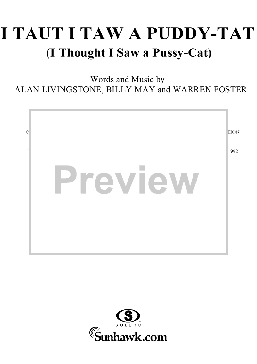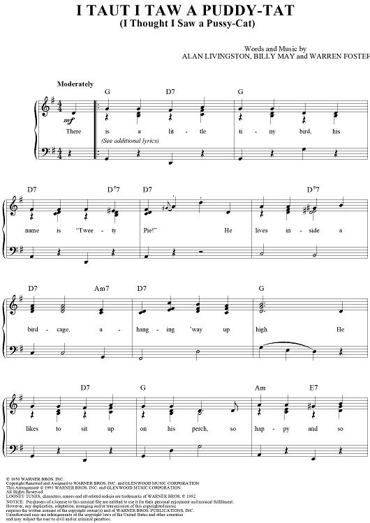 Digital Sheet Music for I Taut I Taw a Puddy-Tat (I Thought I Saw a Pussy-Cat) by Alan Livingston, Billy May, Warren Foster, Tweety Pie scored for Piano/Vocal/Chords; id:151613