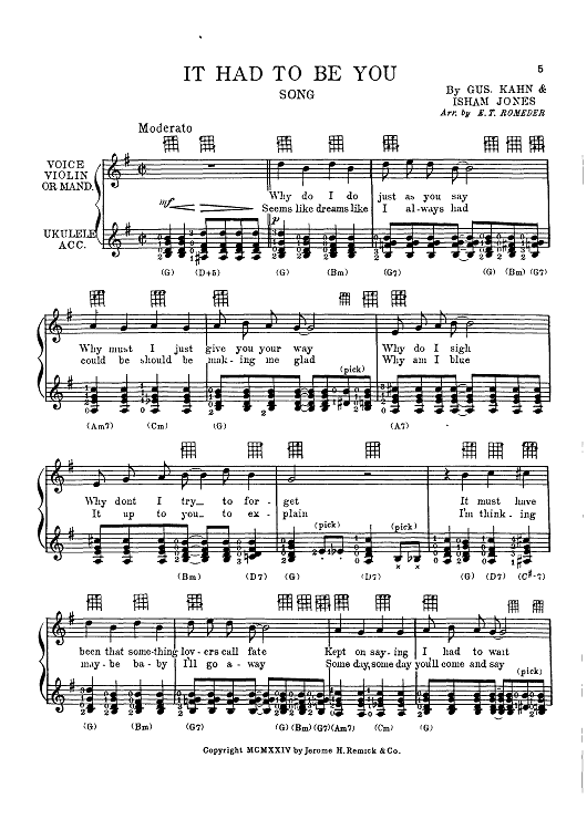 Digital Sheet Music for It Had To Be You by Gus Kahn, Isham Jones, E. T. Romeder scored for Ukulele; id:418668