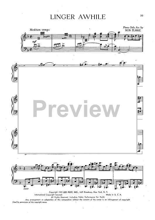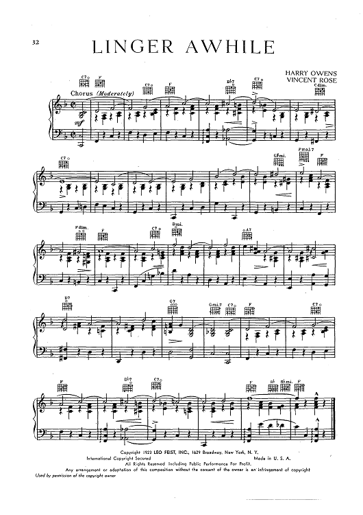 Digital Sheet Music for Linger Awhile by Vincent Rose, Bob Zurke, Harry Owens scored for Piano Solo; id:423061
