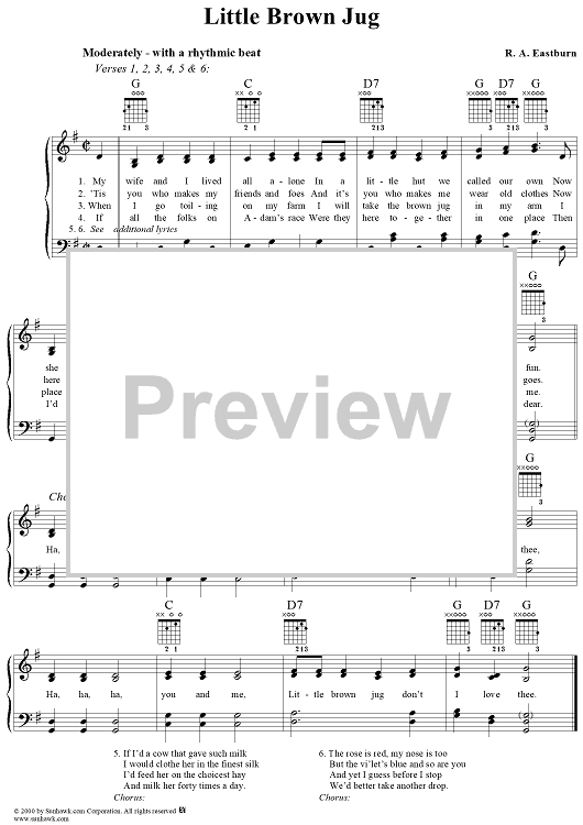 Digital Sheet Music for Little Brown Jug by R. A. Eastburn scored for Piano/Vocal/Chords; id:270589