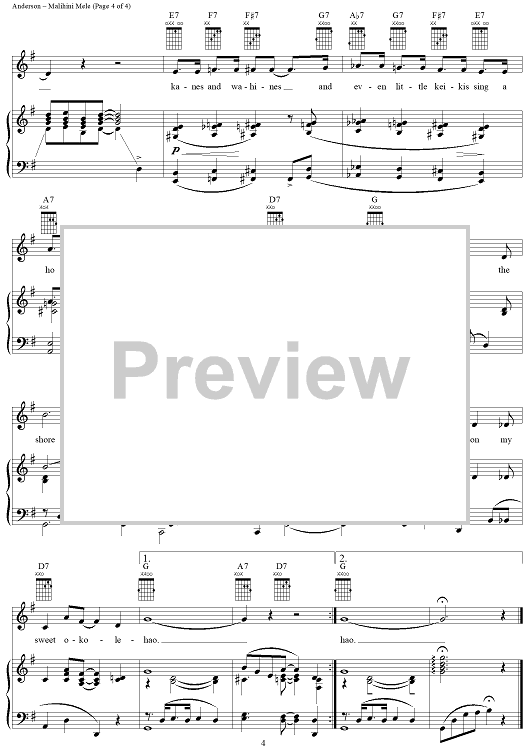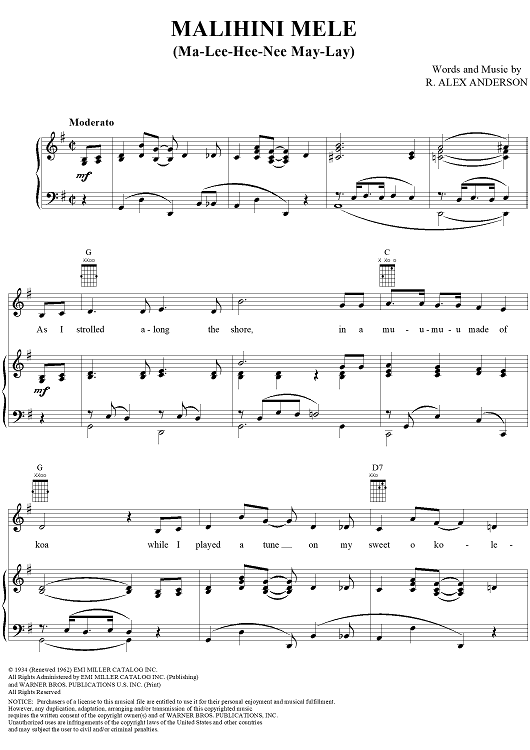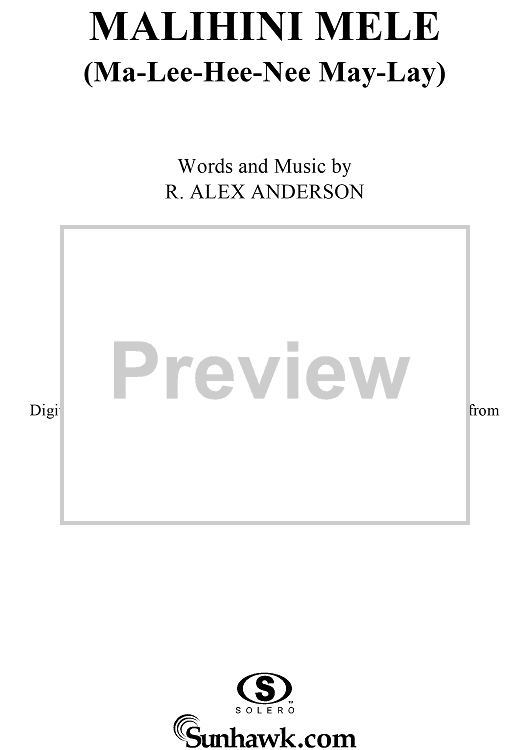 Digital Sheet Music for Malihini Mele (Ma-Lee-Hee-Nee-May-Lay) by R. Alex Anderson scored for Piano/Vocal/Chords; id:276961