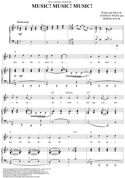 Digital Sheet Music for Music! Music! Music! (Put Another Nickel In) by Stephan Weiss, Bernie Baum scored for Piano/Vocal/Chords; id:430321