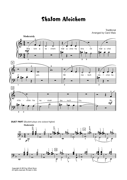 Digital Sheet Music for Shalom Aleichem by Carol Matz, Traditional scored for Piano; id:461274