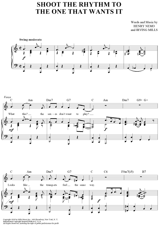 Digital Sheet Music for Shoot The Rhythm To The One That Wants It by Irving Mills, Henry Nemo scored for Piano/Vocal/Chords; id:419368